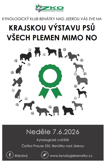 I letos vás zveme na Krajskou výstavu psů všech plemen mimo NO, která se bude konat 7.6.2026 v ZKO Benátky nad Jizerou.